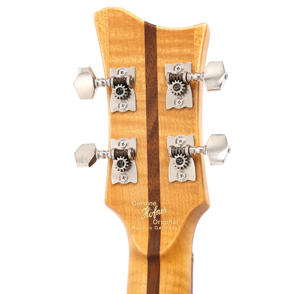 One of our aims with this instrument has been to eliminate as much plastic as possible and to use an environmentally friendly finish whilst retaining the looks and sound of the iconic Violin Bass. To this end the plastics used in the headplate, truss rod cover, heel plate, nut, pickup surrounds, scratchplate, dot markers and body binding have all been replaced with non-endangered walnut wood. The tuners and buttons are now metal which can easily be recycled. We replaced the ebony bridge with one crafted from walnut. The bass is finished in a light wax coat which is not poisonous to the environment and also very easy to repair should that be needed in the future.