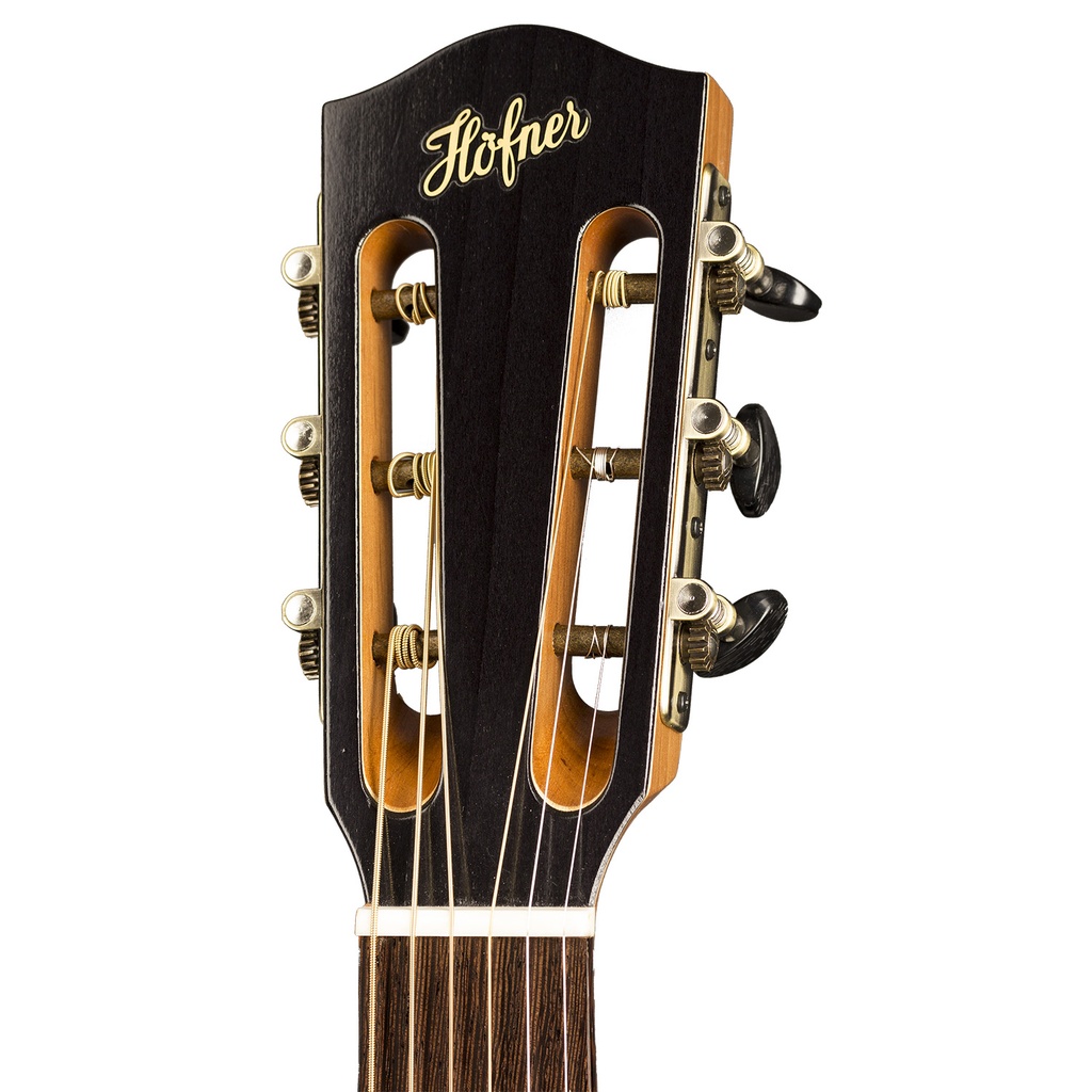The CS8 is a superlative new Höfner model distinguished by its selected thermo-spruce top and body of larch. Larch is rarely used for a guitar but it is very suitable for this vibrant model as the wood is not too hard, yet it is firm and elastic. A gentle smoking process turns it into a visual treat with a play of colours from rich gold to dark chocolate. Thin layers of natural oils, resins and waxes allow the wood to breathe freely and create an exciting surface texture. To preserve the natural look, the active pickup system is discreetly built-in without any opening in the sides.