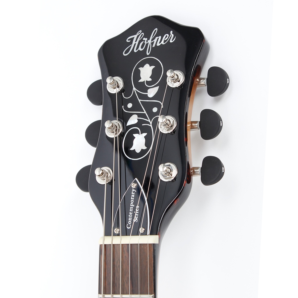 The Blue Tone Jazz Guitar Series introduces a new level of full and musical jazz tones to the Höfner range. The Super-Luxe models have many traditional Höfner jazz guitar featues including spruce top, flame maple back and sides, ebony hardware and rosewood fingerboard, single pick-up, volume and tone controls.