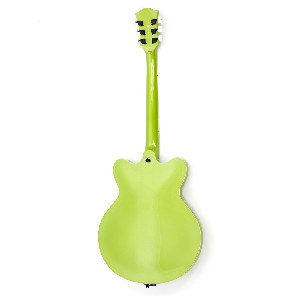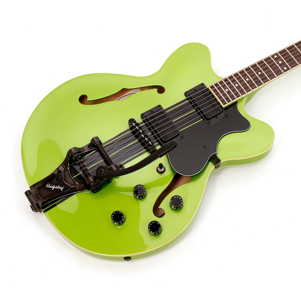 A limited edition of the famous Höfner Verythin guitar. Based on the original classic guitar body shape from 1960 with the body depth of only 1.25 inches the Hofner Verythin was extremely popular with groups during the 1960s beat boom era. This special edition is finished in Metallic Green with black hardware, features a genuine Bigsby vibrato unit and has dot fret position markers. The Hofner Verythin CT not only captures that unique 60s sound but also has the ability to produce tones ranging from deep gutsy blues through to cutting distorted rock. At Hofner we achieve this by fitting a centre block in the body to produce more sustain, deeper tones and less feedback.