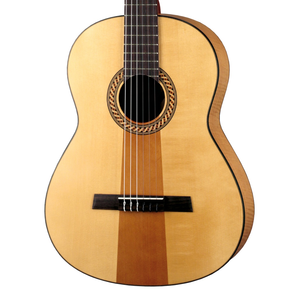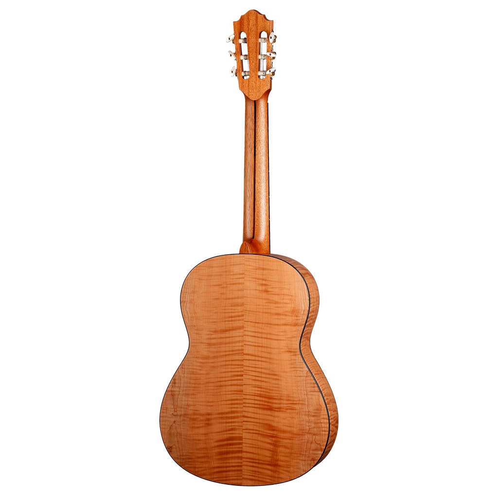 This Höfner classical guitar uses a combination of spruce and cedar for the top, giving it a distinctive appearance and a unique sound. It combines the best characteristics of both tonewoods, both visually and aurally. With a flamed hard maple body and a satin finish, its beautiful appearance is only matched by the superb tonal qualities. The HF14 has proved very popular with students, particularly younger ones, who like the unusual twin wood top and style. Built to our very high standards in our workshops in Germany, it is a robust guitar able to withstand the knock and bangs of everyday life and is a fine instrument which is excellent value for money.