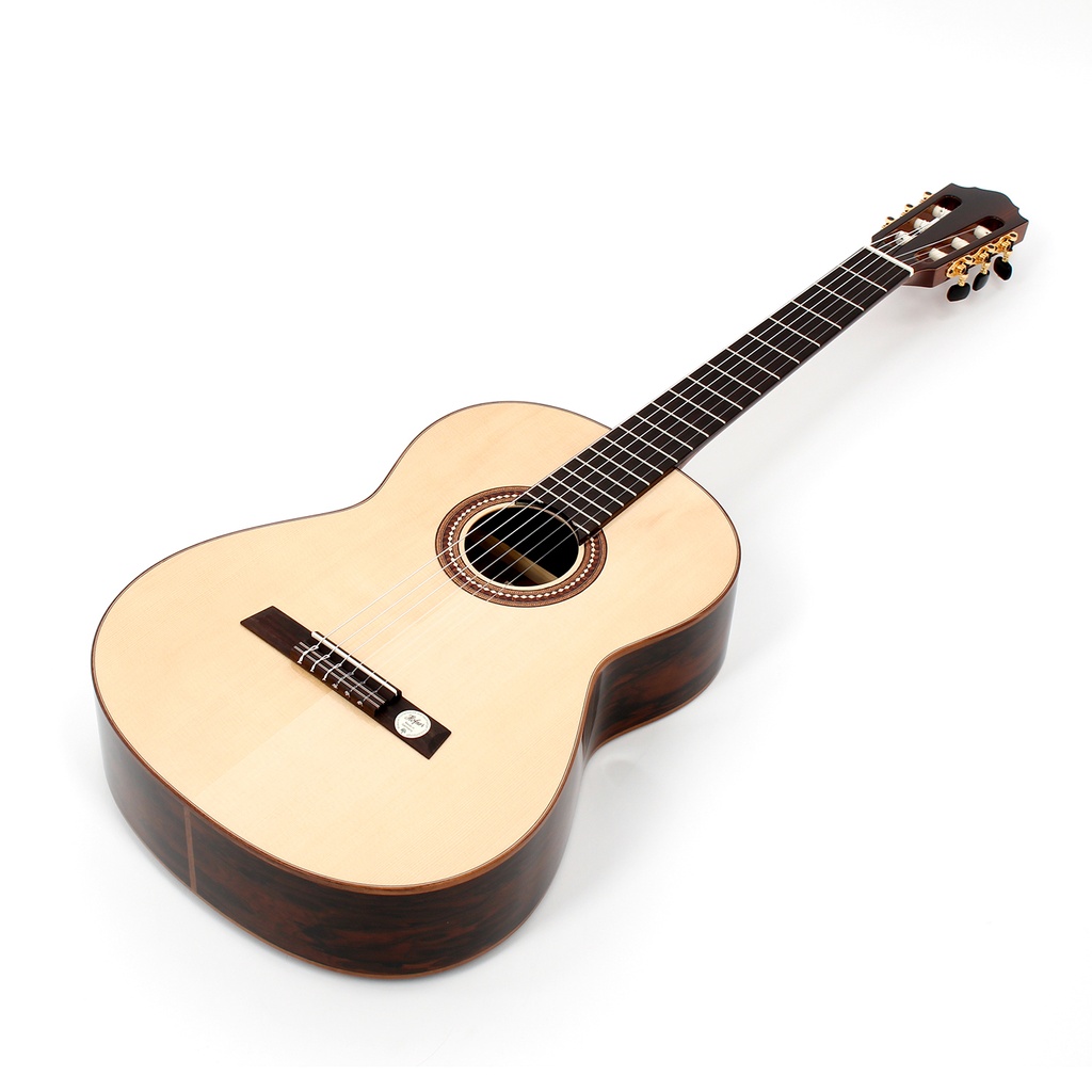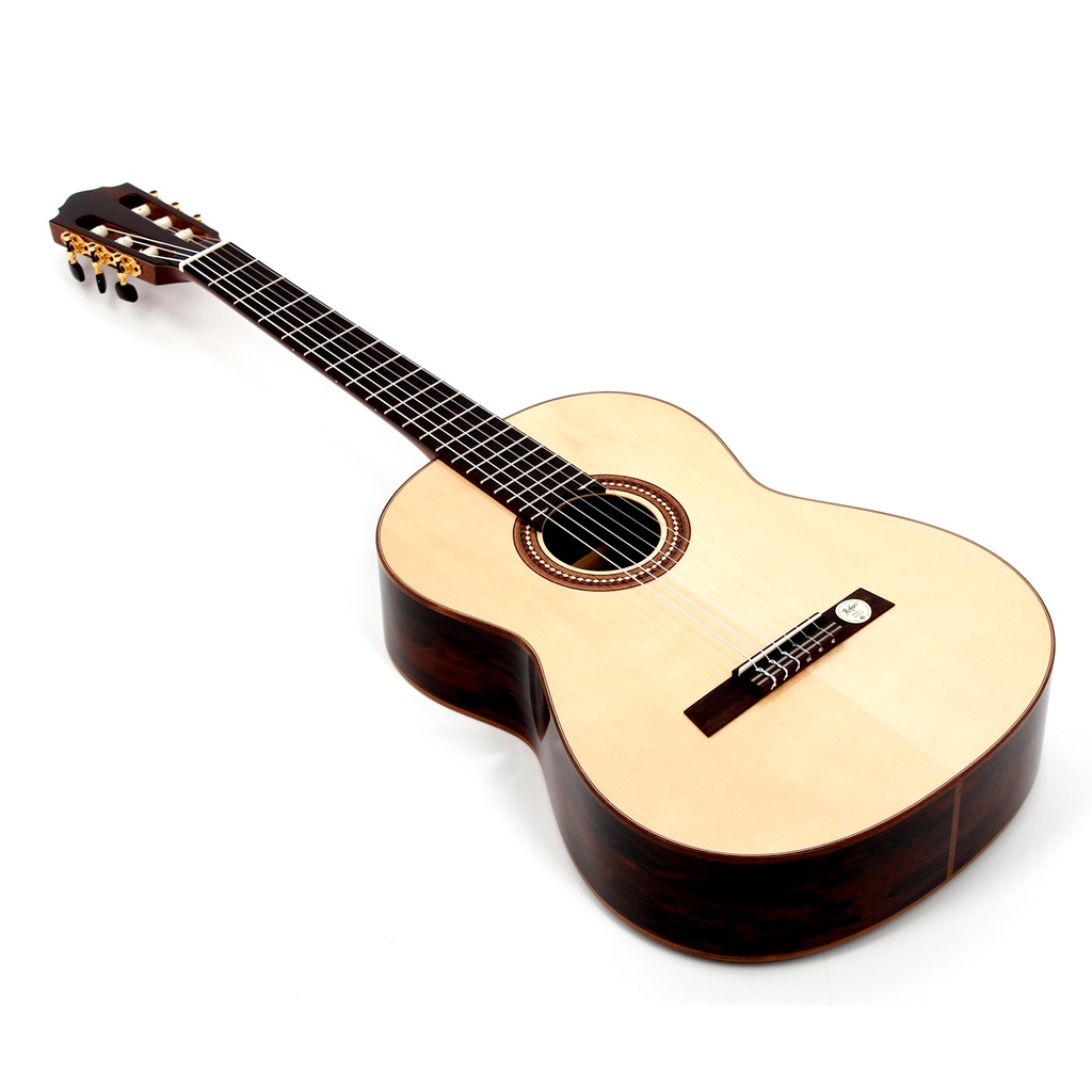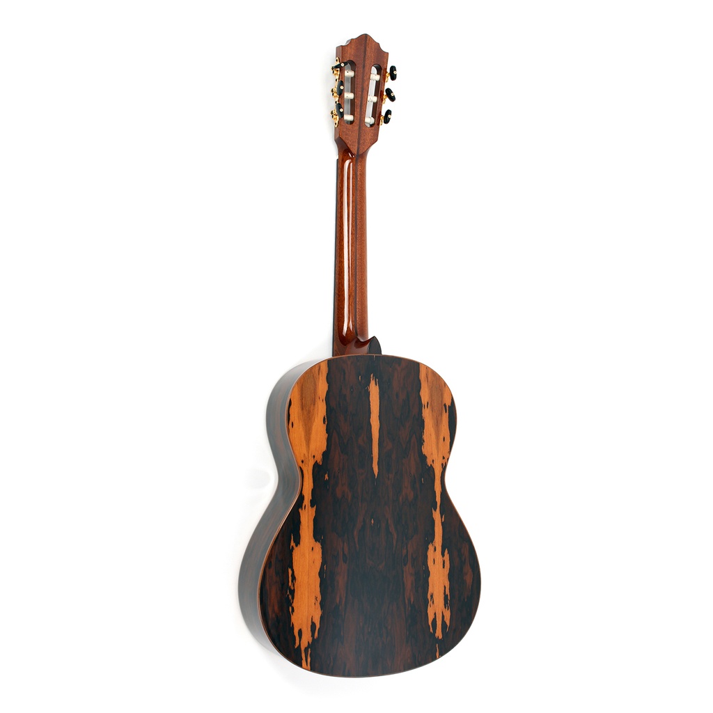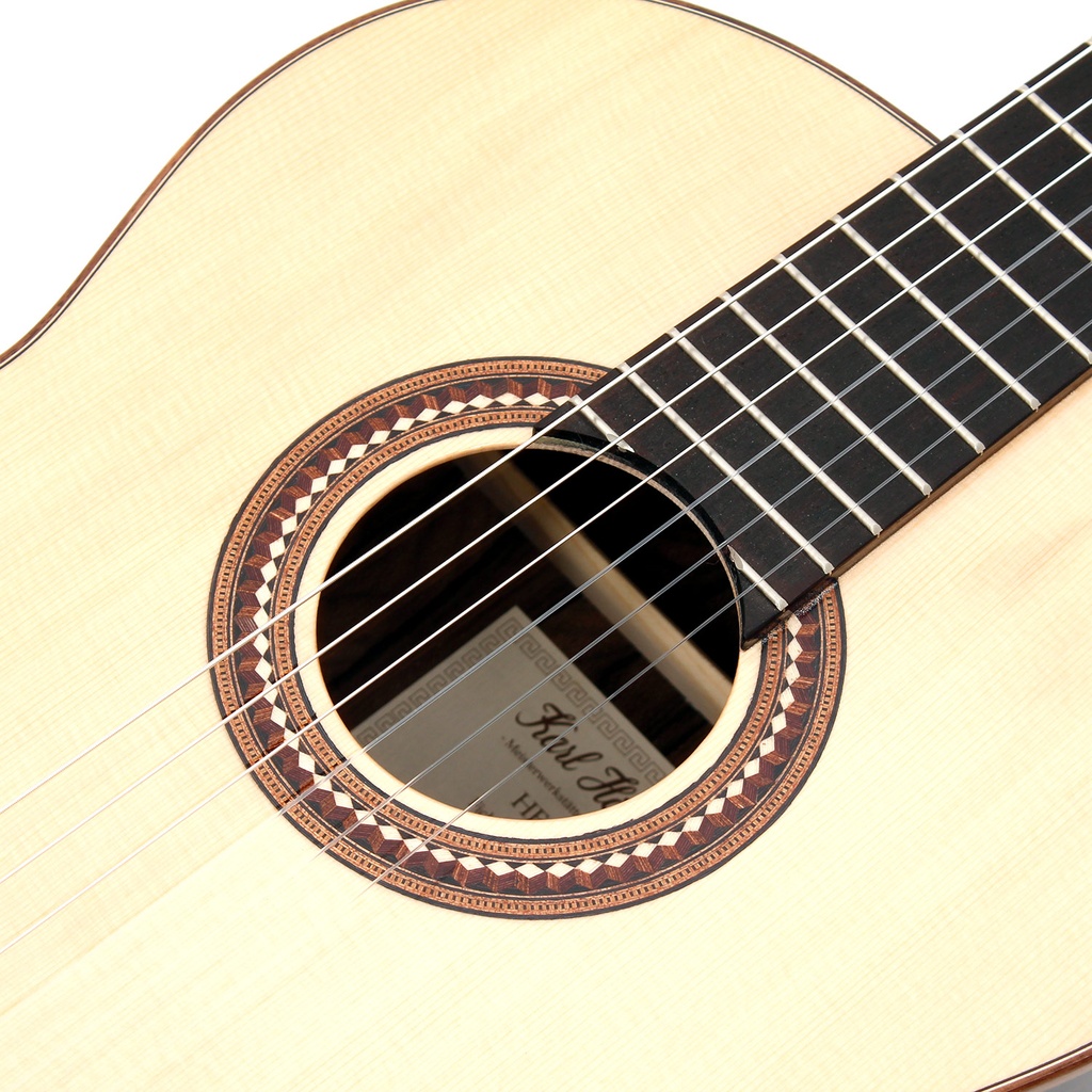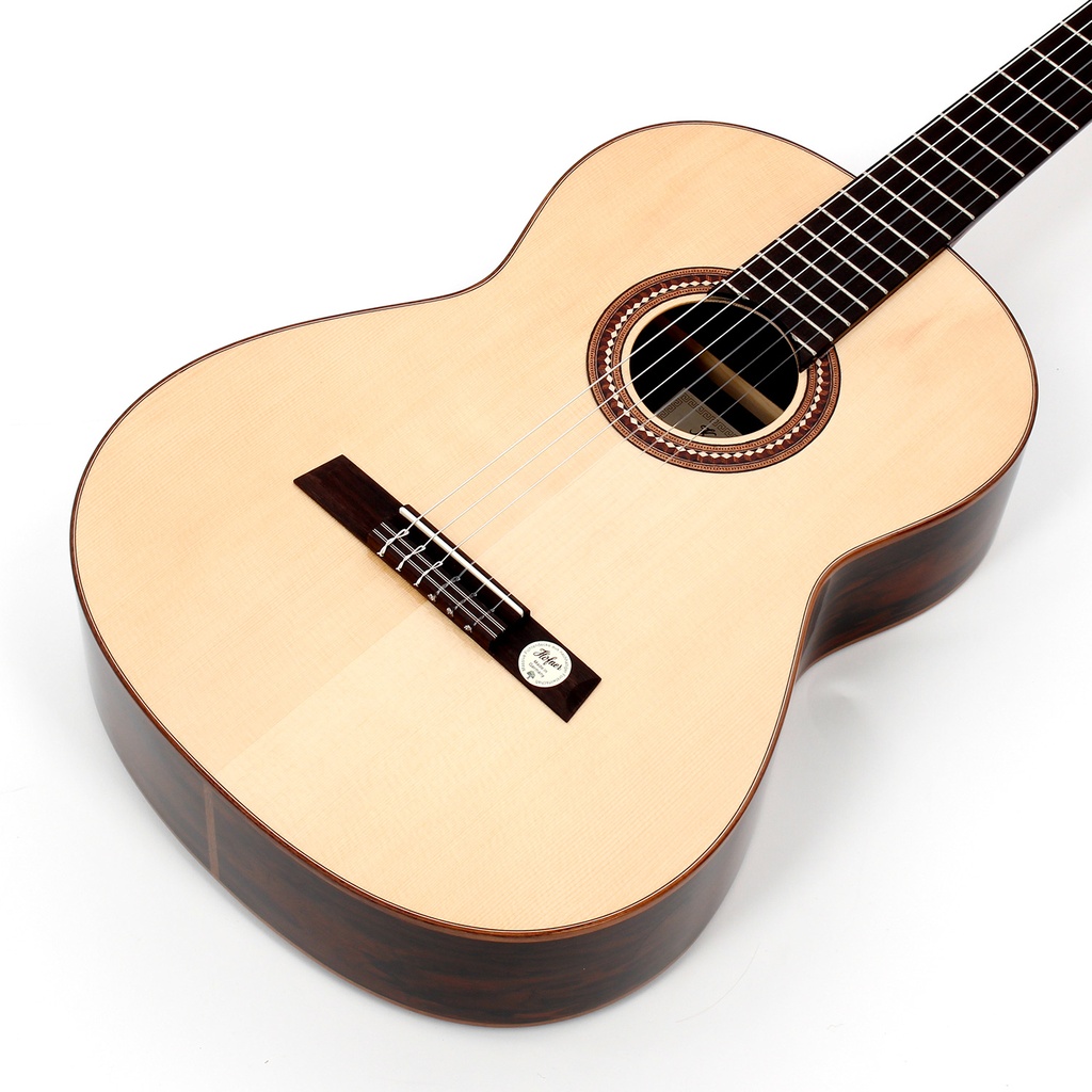 This beautiful Höfner classical guitar has a laurel body with a highly figured grain. The spruce top provides both, definition and powerful sound projection. All the inlays and the bridge are crafted from high-grade tonewoods. This classical guitar also has high-quality cast brass machine heads. Wood, being a natural product, can produce a different appearance in each and every guitar, thereby giving each owner a distinctive and unique instrument. The play of colours can range from nearly black over chocolate to a deep and lustrous gold.