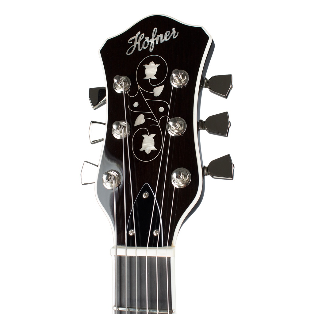 Twin pick-up thinline guitar with solid hand carved centre block. Vintage voiced humbucking pick-ups with coil taps. Volume (push/pull for coil tap) and tone controls plus three way switch. Spruce top, maple back, sides and neck. Ebony fingerboard. Genuine Bigsby vibrato. Available in black. Incl. Höfner Deluxe case.