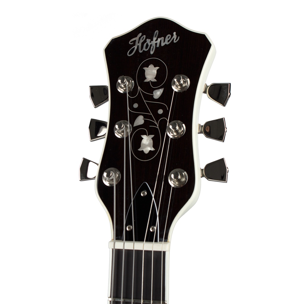 Twin pick-up thinline guitar with solid hand carved centre block. Vintage voiced humbucking pick-ups with coil taps. Volume (push/pull for coil tap) and tone controls plus three way switch. Spruce top, maple back, sides and neck. Ebony fingerboard. Genuine Bigsby vibrato. Available in black or ivory. Incl. Höfner Deluxe case.