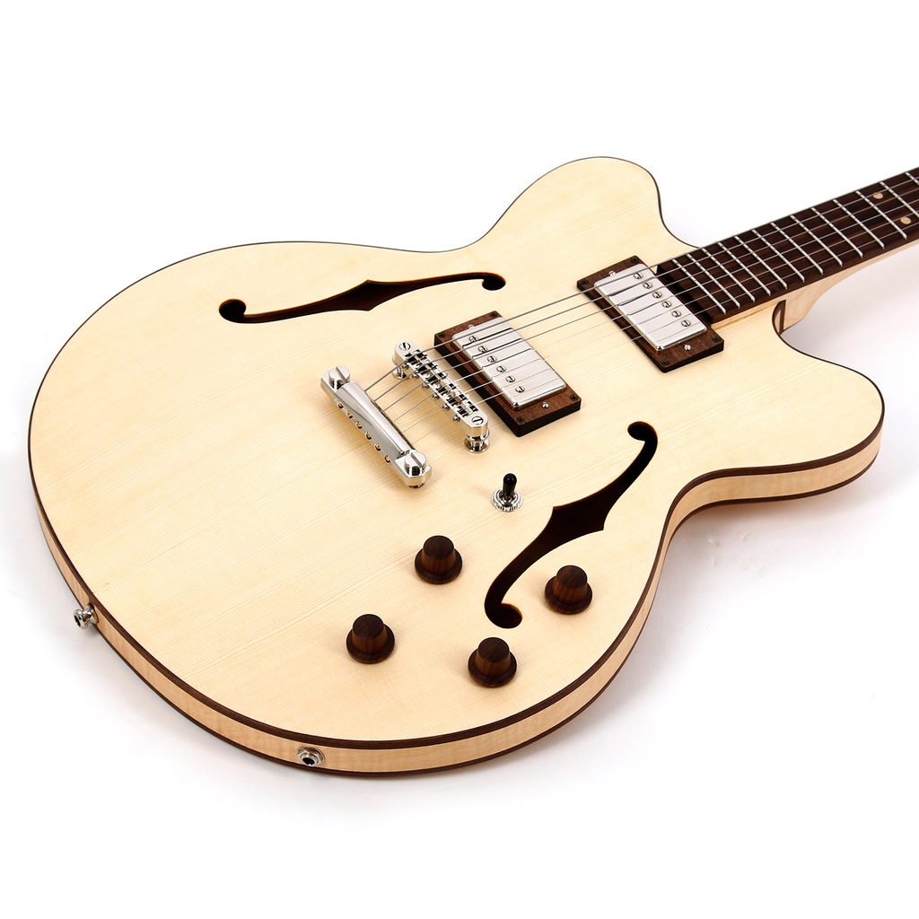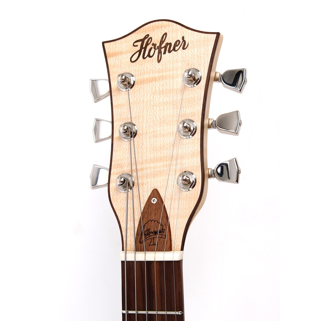 It has a spruce top, maple back and sides, maple neck. A pair of NOwaxx humbuckers are fitted, made exclusively for Höfner by this small Bavarian firm. The fretboard is also of walnut which we found to be equally as good for tone and playability as traditional, but now endangered, rosewood.