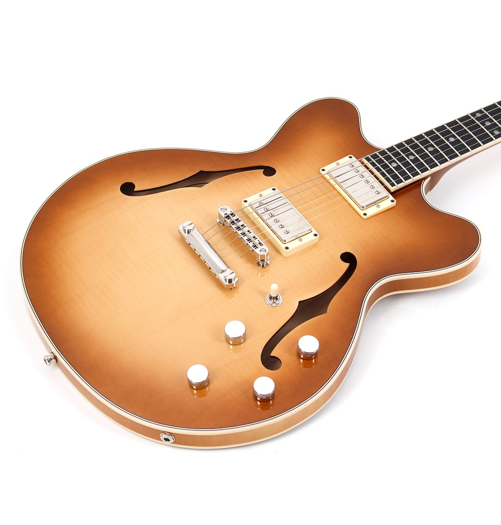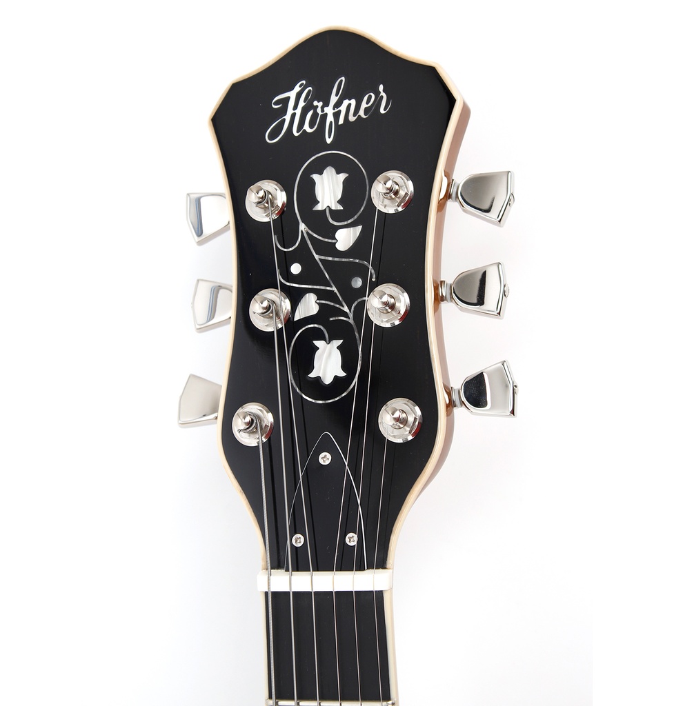 The super thin body is lightweight and extremely comfortable to play. The Standard model features flame maple top, back and sides, a sold spruce centre block for less feedback and good sustain, twin Höfner humbucking pickups for a wide and powerful tone output. The pickups are connected to twin volume and twin tone controls, while there is a tunamatic bridge with a stop tailpiece.