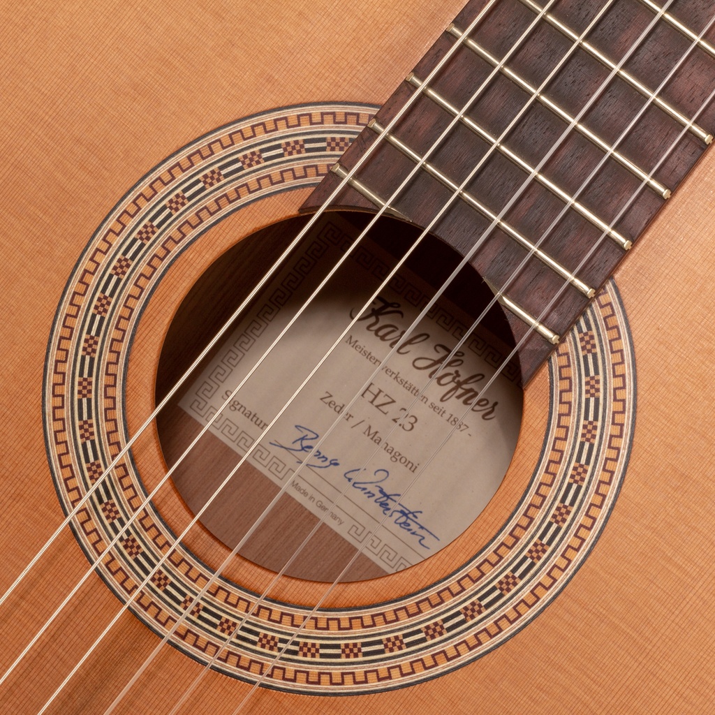 The Höfner HZ23 is a beautiful handmade guitar that allows all musicians access to quality workmanship and sound. It has a beautifully figured mahogany body and a solid cedar top, giving a bright tone with excellent projection and full and warm tonal characteristics. It is finished in a matt lacquer, with a cream binding complementing the caramel tones of the body and giving it a very smart appearance. With a scale of 650mm and a nut width of 50mm, this instrument is the ideal student’s model. Made with craftsmanship and care in the Höfner workshops in Germany, this is a guitar that looks as good as it sounds and is also excellent value for money.